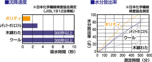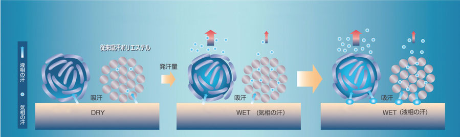 水分の拡散・蒸発性能の向上により、通常のポリエステルよりも速乾性に優れています。内部に湿気がこもらず清潔で、洗濯後もすばやく乾きます。